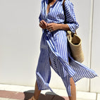 Entdecken Sie das klassische gestreifte Kleid Amélie, entworfen, um Stil und Bequemlichkeit mühelos zu verbinden. Sein weiter Schnitt und klassische Details verleihen eine schmeichelhafte Silhouette und bieten zugleich große Bewegungsfreiheit. Ideal für die Arbeit, einen Brunch oder einen lockeren Ausflug, vereint dieses Kleid Eleganz und Komfort im Alltag. Hergestellt aus atmungsaktivem Premiumstoff, ist es weich im Griff und pflegeleicht. Mit seinem zeitlosen Kragen und dem vielseitigen asymmetrischen Saum passt es sich perfekt allen Gelegenheiten an, vom Tag bis zum Abend.